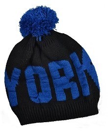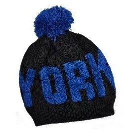 Le graphisme NEW YORK est en grosses lettres bleues sur chaque côté du bonnet mode.